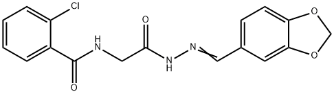 - Synonyms: N-{2-[(2E)-2-(1,3-benzodioxol-5-ylmethylidene)hydrazinyl]-2-oxoethyl}-2-chlorobenzamide (non-preferred name) Glycine, N-(2-chlorobenzoyl)-, (1,3-benzodioxol-5-ylmethylene)hydrazide (9CI) N-(2-(2-(1,3-BENZODIOXOL-5-YLMETHYLENE)HYDRAZINO)-2-OXOETHYL)-2-CHLOROBENZAMIDE