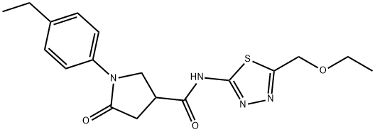 - Synonyms: N-[5-(ethoxymethyl)-1,3,4-thiadiazol-2-yl]-1-(4-ethylphenyl)-5-oxopyrrolidine-3-carboxamide 3-Pyrrolidinecarboxamide, N-[5-(ethoxymethyl)-1,3,4-thiadiazol-2-yl]-1-(4-ethylphenyl)-5-oxo-
