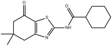 - Synonyms: N-(5,5-dimethyl-7-oxo-4,5,6,7-tetrahydrobenzo[d]thiazol-2-yl)cyclohexanecarboxamide N-(5,5-dimethyl-7-oxo-4,5,6,7-tetrahydro-1,3-benzothiazol-2-yl)cyclohexanecarboxamide Cyclohexanecarboxamide, N-(4,5,6,7-tetrahydro-5,5-dimethyl-7-oxo-2-benzothiazolyl)-