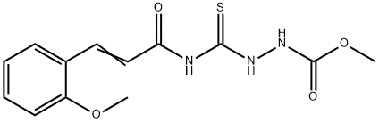 - Synonyms: methyl 2-({[3-(2-methoxyphenyl)acryloyl]amino}carbonothioyl)hydrazinecarboxylate methyl 2-{[(2E)-3-(2-methoxyphenyl)prop-2-enoyl]carbamothioyl}hydrazinecarboxylate Hydrazinecarboxylic acid, 2-[[[3-(2-methoxyphenyl)-1-oxo-2-propen-1-yl]amino]thioxomethyl]-, methyl ester