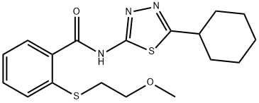 - Synonyms: N-(5-cyclohexyl-1,3,4-thiadiazol-2-yl)-2-(2-methoxyethylsulfanyl)benzamide Benzamide, N-(5-cyclohexyl-1,3,4-thiadiazol-2-yl)-2-[(2-methoxyethyl)thio]-