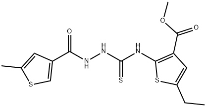 - Synonyms: methyl 5-ethyl-2-(2-(5-methylthiophene-3-carbonyl)hydrazinecarbothioamido)thiophene-3-carboxylate 3-Thiophenecarboxylic acid, 5-ethyl-2-[[[2-[(5-methyl-3-thienyl)carbonyl]hydrazinyl]thioxomethyl]amino]-, methyl ester