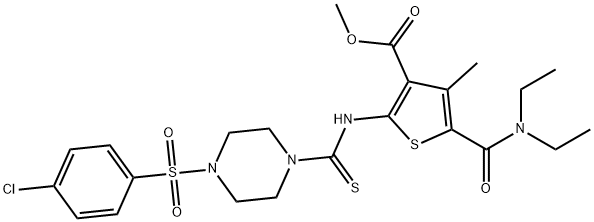 - Synonyms: methyl 2-(4-((4-chlorophenyl)sulfonyl)piperazine-1-carbothioamido)-5-(diethylcarbamoyl)-4-methylthiophene-3-carboxylate 3-Thiophenecarboxylic acid, 2-[[[4-[(4-chlorophenyl)sulfonyl]-1-piperazinyl]thioxomethyl]amino]-5-[(diethylamino)carbonyl]-4-methyl-, methyl ester