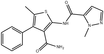 - Synonyms: N-(3-carbamoyl-5-methyl-4-phenylthiophen-2-yl)-2-methylpyrazole-3-carboxamide 1H-Pyrazole-5-carboxamide, N-[3-(aminocarbonyl)-5-methyl-4-phenyl-2-thienyl]-1-methyl-