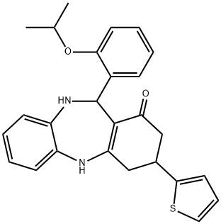 - Synonyms: 6-(2-propan-2-yloxyphenyl)-9-thiophen-2-yl-5,6,8,9,10,11-hexahydrobenzo[b][1,4]benzodiazepin-7-one 1H-Dibenzo[b,e][1,4]diazepin-1-one, 2,3,4,5,10,11-hexahydro-11-[2-(1-methylethoxy)phenyl]-3-(2-thienyl)-