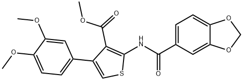 - Synonyms: methyl 2-(1,3-benzodioxole-5-carbonylamino)-4-(3,4-dimethoxyphenyl)thiophene-3-carboxylate 3-Thiophenecarboxylic acid, 2-[(1,3-benzodioxol-5-ylcarbonyl)amino]-4-(3,4-dimethoxyphenyl)-, methyl ester