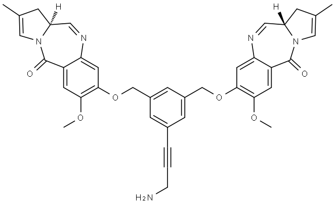 - Synonyms: (S)-8-((3-(3-aminoprop-1-yn-1-yl)-5-((((S)-7-methoxy-2-methyl-5-oxo-5,10,11,11a-tetrahydro-1H-benzo[e]pyrrolo[1,2-a][1,4]diazepin-8-yl)oxy)methyl)benzyl)oxy)-7-methoxy-2-methyl-1,11a-dihydro-5H-benzo[ 5H-Pyrrolo[2,1-c][1,4]benzodiazepin-5-one, 8,8′-[[5-(3-amino-1-propyn-1-yl)-1,3-phenylene]bis(methyleneoxy)]bis[1,11a-dihydro-7-methoxy-2-methyl-, (11aS,11′aS)-