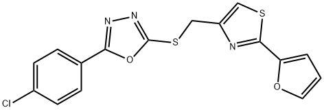- Synonyms: 2-(4-chlorophenyl)-5-[[2-(furan-2-yl)-1,3-thiazol-4-yl]methylsulfanyl]-1,3,4-oxadiazole 2-(4-chlorophenyl)-5-({[2-(2-furyl)-1,3-thiazol-4-yl]methyl}sulfanyl)-1,3,4-oxadiazole 1,3,4-Oxadiazole, 2-(4-chlorophenyl)-5-[[[2-(2-furanyl)-4-thiazolyl]methyl]thio]-