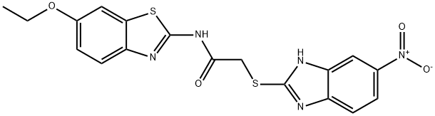 - Synonyms: N-(6-ethoxy-1,3-benzothiazol-2-yl)-2-[(5-nitro-1H-benzimidazol-2-yl)sulfanyl]acetamide Acetamide, N-(6-ethoxy-2-benzothiazolyl)-2-[(6-nitro-1H-benzimidazol-2-yl)thio]-