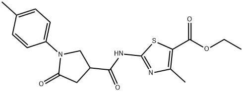 - Synonyms: ethyl 4-methyl-2-({[1-(4-methylphenyl)-5-oxopyrrolidin-3-yl]carbonyl}amino)-1,3-thiazole-5-carboxylate 5-Thiazolecarboxylic acid, 4-methyl-2-[[[1-(4-methylphenyl)-5-oxo-3-pyrrolidinyl]carbonyl]amino]-, ethyl ester