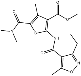 - Synonyms: methyl 5-(dimethylcarbamoyl)-2-(3-ethyl-5-methylisoxazole-4-carboxamido)-4-methylthiophene-3-carboxylate 3-Thiophenecarboxylic acid, 5-[(dimethylamino)carbonyl]-2-[[(3-ethyl-5-methyl-4-isoxazolyl)carbonyl]amino]-4-methyl-, methyl ester