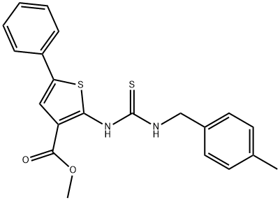 - Synonyms: methyl 2-(3-(4-methylbenzyl)thioureido)-5-phenylthiophene-3-carboxylate 3-Thiophenecarboxylic acid, 2-[[[[(4-methylphenyl)methyl]amino]thioxomethyl]amino]-5-phenyl-, methyl ester