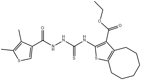 - Synonyms: ethyl 2-(2-(4,5-dimethylthiophene-3-carbonyl)hydrazinecarbothioamido)-4,5,6,7,8,9-hexahydrocycloocta[b]thiophene-3-carboxylate Cycloocta[b]thiophene-3-carboxylic acid, 2-[[[2-[(4,5-dimethyl-3-thienyl)carbonyl]hydrazinyl]thioxomethyl]amino]-4,5,6,7,8,9-hexahydro-, ethyl ester
