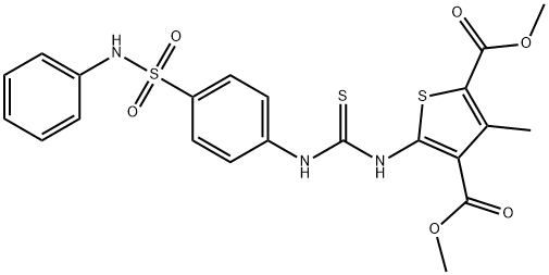 - Synonyms: dimethyl 3-methyl-5-(3-(4-(N-phenylsulfamoyl)phenyl)thioureido)thiophene-2,4-dicarboxylate 2,4-Thiophenedicarboxylic acid, 3-methyl-5-[[[[4-[(phenylamino)sulfonyl]phenyl]amino]thioxomethyl]amino]-, 2,4-dimethyl ester