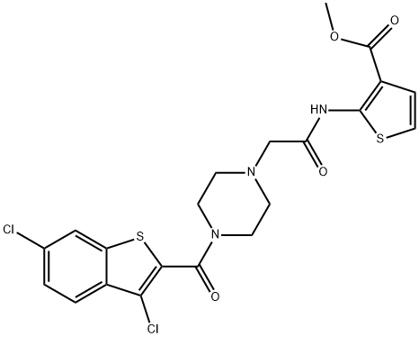 - Synonyms: methyl 2-(2-(4-(3,6-dichlorobenzo[b]thiophene-2-carbonyl)piperazin-1-yl)acetamido)thiophene-3-carboxylate 3-Thiophenecarboxylic acid, 2-[[2-[4-[(3,6-dichlorobenzo[b]thien-2-yl)carbonyl]-1-piperazinyl]acetyl]amino]-, methyl ester