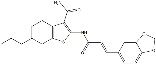 - Synonyms: 2-[[(E)-3-(1,3-benzodioxol-5-yl)prop-2-enoyl]amino]-6-propyl-4,5,6,7-tetrahydro-1-benzothiophene-3-carboxamide