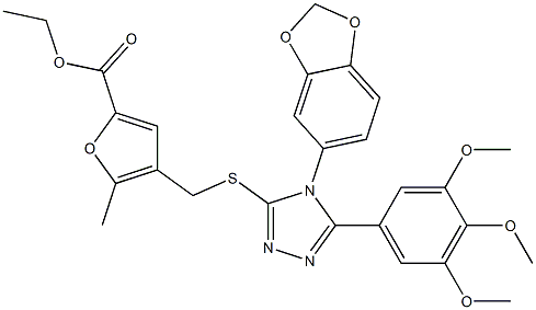 - Synonyms: ethyl 4-[[4-(1,3-benzodioxol-5-yl)-5-(3,4,5-trimethoxyphenyl)-1,2,4-triazol-3-yl]sulfanylmethyl]-5-methylfuran-2-carboxylate
