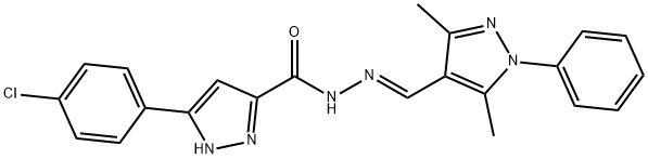 - Synonyms: 3-(4-chlorophenyl)-N-[(E)-(3,5-dimethyl-1-phenylpyrazol-4-yl)methylideneamino]-1H-pyrazole-5-carboxamide 1H-Pyrazole-3-carboxylic acid, 5-(4-chlorophenyl)-, (2E)-2-[(3,5-dimethyl-1-phenyl-1H-pyrazol-4-yl)methylene]hydrazide 3-(4-CHLOROPHENYL)-N'-[(E)-(3,5-DIMETHYL-1-PHENYL-1H-PYRAZOL-4-YL)METHYLIDENE]-1H-PYRAZOLE-5-CARBOHYDRAZIDE 3-(4-CHLOROPHENYL)-N'-[(E)-(3,5-DIMETHYL-1-PHENYL-1H-PYRAZOL-4-YL)METHYLIDENE]-1H-PYRAZOLE-5-CARBOHYDRAZIDE