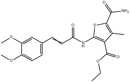 - Synonyms: ethyl 5-carbamoyl-2-[[(E)-3-(3,4-dimethoxyphenyl)prop-2-enoyl]amino]-4-methylthiophene-3-carboxylate 3-Thiophenecarboxylic acid, 5-(aminocarbonyl)-2-[[3-(3,4-dimethoxyphenyl)-1-oxo-2-propen-1-yl]amino]-4-methyl-, ethyl ester