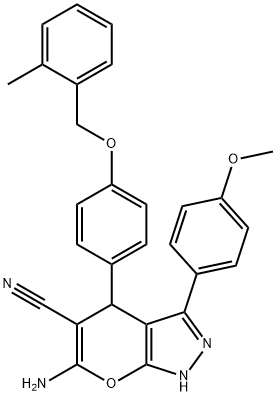 - Synonyms: 6-amino-3-(4-methoxyphenyl)-4-[4-[(2-methylphenyl)methoxy]phenyl]-2,4-dihydropyrano[2,3-c]pyrazole-5-carbonitrile Pyrano[2,3-c]pyrazole-5-carbonitrile, 6-amino-1,4-dihydro-3-(4-methoxyphenyl)-4-[4-[(2-methylphenyl)methoxy]phenyl]-