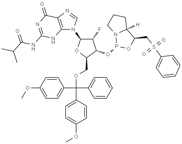 - Synonyms: (L)-PSM-fG-Sp Guanosine, 5′-O-[bis(4-methoxyphenyl)phenylmethyl]-2′-deoxy-2′-fluoro-N-(2-methyl-1-oxopropyl)-3′-O-[(1S,3S,3aS)-tetrahydro-3-[(phenylsulfonyl)methyl]-1H,3H-pyrrolo[1,2-c][1,3,2]oxazaphosphol-1-yl]-
