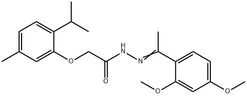 - Synonyms: N'-[1-(2,4-dimethoxyphenyl)ethylidene]-2-(2-isopropyl-5-methylphenoxy)acetohydrazide N'-[(1E)-1-(2,4-dimethoxyphenyl)ethylidene]-2-[5-methyl-2-(propan-2-yl)phenoxy]acetohydrazide Acetic acid, 2-[5-methyl-2-(1-methylethyl)phenoxy]-, 2-[1-(2,4-dimethoxyphenyl)ethylidene]hydrazide