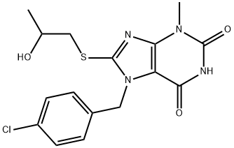 - Synonyms: 7-(4-chlorobenzyl)-8-((2-hydroxypropyl)thio)-3-methyl-3,7-dihydro-1H-purine-2,6-dione 1H-Purine-2,6-dione, 7-[(4-chlorophenyl)methyl]-3,7-dihydro-8-[(2-hydroxypropyl)thio]-3-methyl- 7-(4-CL-BENZYL)-8-(2-HYDROXY-PROPYLSULFANYL)-3-ME-3,7-DIHYDRO-PURINE-2,6-DIONE