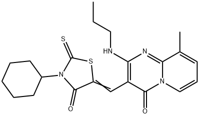 - Synonyms: (Z)-3-cyclohexyl-5-((9-methyl-4-oxo-2-(propylamino)-4H-pyrido[1,2-a]pyrimidin-3-yl)methylene)-2-thioxothiazolidin-4-one 3-[(3-cyclohexyl-4-oxo-2-thioxo-1,3-thiazolidin-5-ylidene)methyl]-9-methyl-2-(propylamino)-4H-pyrido[1,2-a]pyrimidin-4-one 4H-Pyrido[1,2-a]pyrimidin-4-one, 3-[(3-cyclohexyl-4-oxo-2-thioxo-5-thiazolidinylidene)methyl]-9-methyl-2-(propylamino)- 3-[(Z)-(3-CYCLOHEXYL-4-OXO-2-THIOXO-1,3-THIAZOLIDIN-5-YLIDENE)METHYL]-9-METHYL-2-(PROPYLAMINO)-4H-PYRIDO[1,2-A]PYRIMIDIN-4-ONE