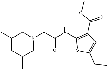 - Synonyms: methyl 2-(2-(3,5-dimethylpiperidin-1-yl)acetamido)-5-ethylthiophene-3-carboxylate 3-Thiophenecarboxylic acid, 2-[[2-(3,5-dimethyl-1-piperidinyl)acetyl]amino]-5-ethyl-, methyl ester