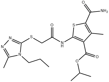- Synonyms: isopropyl 5-carbamoyl-4-methyl-2-(2-((5-methyl-4-propyl-4H-1,2,4-triazol-3-yl)thio)acetamido)thiophene-3-carboxylate 3-Thiophenecarboxylic acid, 5-(aminocarbonyl)-4-methyl-2-[[2-[(5-methyl-4-propyl-4H-1,2,4-triazol-3-yl)thio]acetyl]amino]-, 1-methylethyl ester