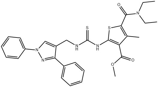 - Synonyms: methyl 5-(diethylcarbamoyl)-2-(3-((1,3-diphenyl-1H-pyrazol-4-yl)methyl)thioureido)-4-methylthiophene-3-carboxylate 3-Thiophenecarboxylic acid, 5-[(diethylamino)carbonyl]-2-[[[[(1,3-diphenyl-1H-pyrazol-4-yl)methyl]amino]thioxomethyl]amino]-4-methyl-, methyl ester
