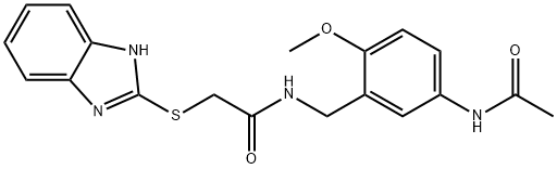 - Synonyms: N-[(5-acetamido-2-methoxyphenyl)methyl]-2-(1H-benzimidazol-2-ylsulfanyl)acetamide Acetamide, N-[[5-(acetylamino)-2-methoxyphenyl]methyl]-2-(1H-benzimidazol-2-ylthio)-