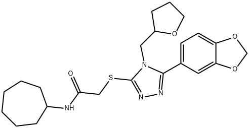 - Synonyms: 2-[[5-(1,3-benzodioxol-5-yl)-4-(oxolan-2-ylmethyl)-1,2,4-triazol-3-yl]sulfanyl]-N-cycloheptylacetamide Acetamide, 2-[[5-(1,3-benzodioxol-5-yl)-4-[(tetrahydro-2-furanyl)methyl]-4H-1,2,4-triazol-3-yl]thio]-N-cycloheptyl-