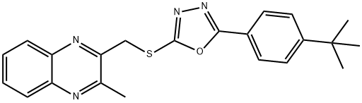 - Synonyms: 2-(4-tert-butylphenyl)-5-[(3-methylquinoxalin-2-yl)methylsulfanyl]-1,3,4-oxadiazole Quinoxaline, 2-[[[5-[4-(1,1-dimethylethyl)phenyl]-1,3,4-oxadiazol-2-yl]thio]methyl]-3-methyl-