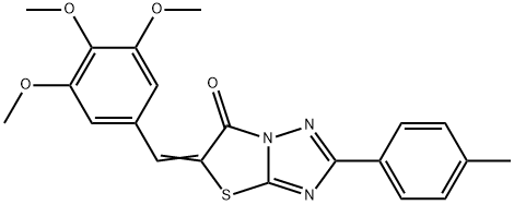- Synonyms: (5E)-2-(4-methylphenyl)-5-[(3,4,5-trimethoxyphenyl)methylidene]-[1,3]thiazolo[3,2-b][1,2,4]triazol-6-one Thiazolo[3,2-b][1,2,4]triazol-6(5H)-one, 2-(4-methylphenyl)-5-[(3,4,5-trimethoxyphenyl)methylene]- (5E)-2-(4-METHYLPHENYL)-5-(3,4,5-TRIMETHOXYBENZYLIDENE)[1,3]THIAZOLO[3,2-B][1,2,4]TRIAZOL-6(5H)-ONE