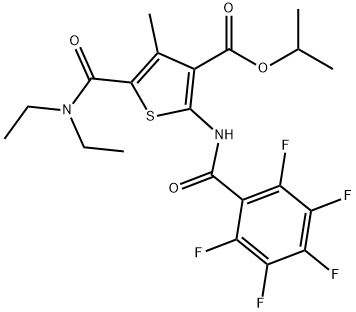 - Synonyms: propan-2-yl 5-(diethylcarbamoyl)-4-methyl-2-[(2,3,4,5,6-pentafluorobenzoyl)amino]thiophene-3-carboxylate 3-Thiophenecarboxylic acid, 5-[(diethylamino)carbonyl]-4-methyl-2-[(2,3,4,5,6-pentafluorobenzoyl)amino]-, 1-methylethyl ester