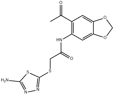 - Synonyms: N-(6-acetyl-1,3-benzodioxol-5-yl)-2-[(5-amino-1,3,4-thiadiazol-2-yl)sulfanyl]acetamide Acetamide, N-(6-acetyl-1,3-benzodioxol-5-yl)-2-[(5-amino-1,3,4-thiadiazol-2-yl)thio]-