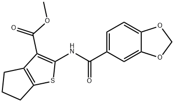 - Synonyms: methyl 2-(1,3-benzodioxole-5-carbonylamino)-5,6-dihydro-4H-cyclopenta[b]thiophene-3-carboxylate 4H-Cyclopenta[b]thiophene-3-carboxylic acid, 2-[(1,3-benzodioxol-5-ylcarbonyl)amino]-5,6-dihydro-, methyl ester