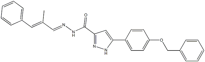 - Synonyms: 5-[4-(benzyloxy)phenyl]-N'-[(1Z,2E)-2-methyl-3-phenylprop-2-en-1-ylidene]-1H-pyrazole-3-carbohydrazide 3-(4-(BENZYLOXY)PH)-N'-(2-ME-3-PH-2-PROPENYLIDENE)-1H-PYRAZOLE-5-CARBOHYDRAZIDE 3-(4-(BENZYLOXY)PH)-N'-(2-ME-3-PH-2-PROPENYLIDENE)-1H-PYRAZOLE-5-CARBOHYDRAZIDE