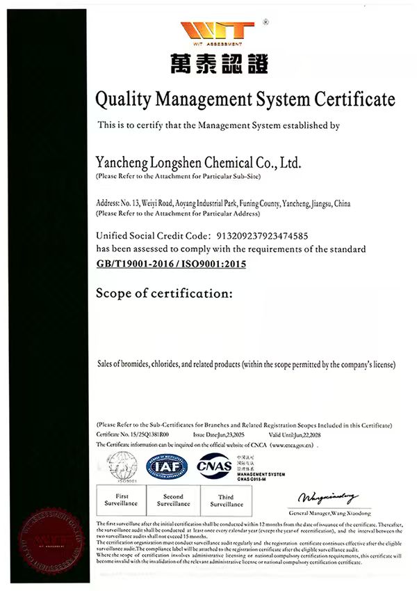 Longshen strictly maintains ISO 9001:2015 and ISO 14001:2015 certifications, has passed the SEDEX (SMETA) social-responsibility audit, and has successfully completed EU REACH registrations for key products. Our QC center is equipped with GC, KF titrators, UV spectrophotometers and other advanced instruments, enabling full QA/QC traceability from raw-material intake to finished-product release.