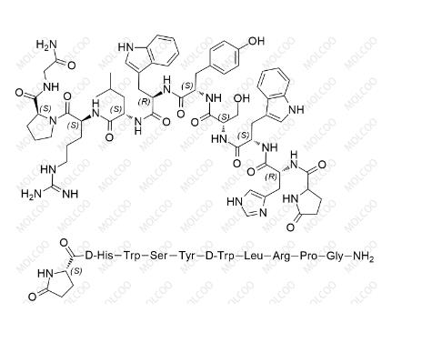 English Alias: Pyr-DHis-Trp-Ser-Tyr-DTrp-Leu-Arg-Pro-Gly-NH2; (2S)-1-((3R,6S,9S,12S,15R,18S,21S)-3-((1H-imidazol-4-yl)methyl)-6,15-bis((1H-indol-3-yl)methyl)-21-(3-guanidinopropyl)-12-(4-hydroxybenzyl)-9-(hydroxymethyl)-18-isobutyl-1,4,7,10,13,16,19-heptaoxo-1-(5-oxopyrrolidin-2-yl)-2,5,8,11,14,17,20-heptaazadocosan-22-oyl)-N-(2-amino-2-oxoethyl)pyrrolidine-2-carboxamide