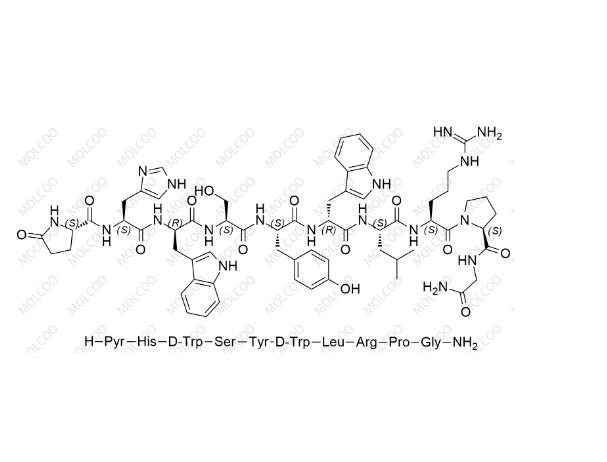 English Alias: Pyr-His-DTrp-Ser-Tyr-DTrp-Leu-Arg-Pro-Gly-NH2; (S)-1-((3S,6R,9S,12S,15R,18S,21S)-3-((1H-imidazol-4-yl)methyl)-6,15-bis((1H-indol-3-yl)methyl)-21-(3-guanidinopropyl)-12-(4-hydroxybenzyl)-9-(hydroxymethyl)-18-isobutyl-1,4,7,10,13,16,19-heptaoxo-1-((S)-5-oxopyrrolidin-2-yl)-2,5,8,11,14,17,20-heptaazadocosan-22-oyl)-N-(2-amino-2-oxoethyl)pyrrolidine-2-carboxamide