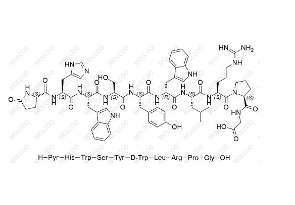 English Alias: Pyr-His-Trp-Ser-Tyr-DTrp-Leu-Arg-Pro-Gly; 2-((S)-1-((3S,6S,9S,12S,15R,18S,21S)-3-((1H-imidazol-5-yl)methyl)-6,15-bis((1H-indol-3-yl)methyl)-21-(3-guanidinopropyl)-12-(4-hydroxybenzyl)-9-(hydroxymethyl)-18-isobutyl-1,4,7,10,13,16,19-heptaoxo-1-((S)-5-oxopyrrolidin-2-yl)-2,5,8,11,14,17,20-heptaazadocosan-22-oyl)pyrrolidine-2-carboxamido)acetic acid