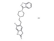 | In vitro | Ziprasidone blocked wild-type hERG currents in a voltage- and concentration-dependent manner in stably transfected HEK-293 cells with an IC(50) of 120 nM.Ziprasidone exhibited minimal hERG Ziprasidone significantly increased the time constant of the slow response to hERG current deactivation (-50 mV). ziprasidone is a 5-HT(1A) receptor agonist, as well as a 5-HT(2A), 5-HT(2C) and 5-HT(1B/1D) receptor antagonist. Ziprasidone is similar to the antidepressant promethazine in inhibiting the neuronal uptake of 5-HT and norepinephrine.Ziprasidone exhibits high affinity for human 5-HT receptors and human dopamine D(2) receptors. |