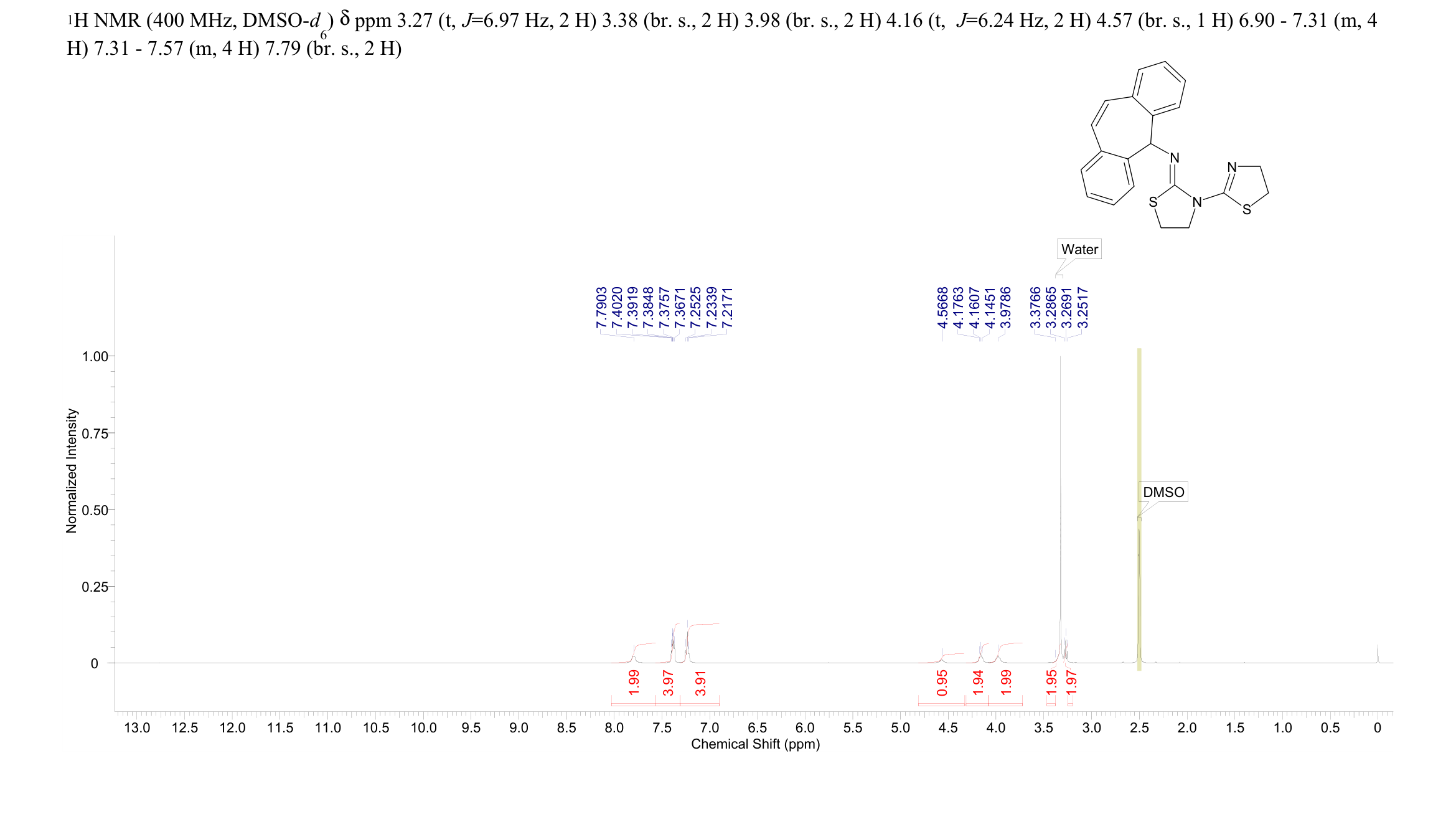 1072145-33-5更多图谱N-(3-(4,5-二氢噻唑-2-基)噻唑烷-2-亚基)-5H-二苯并[A,D][7]轮烯-5-胺(1072145-33-5)核磁图(1HNMR)