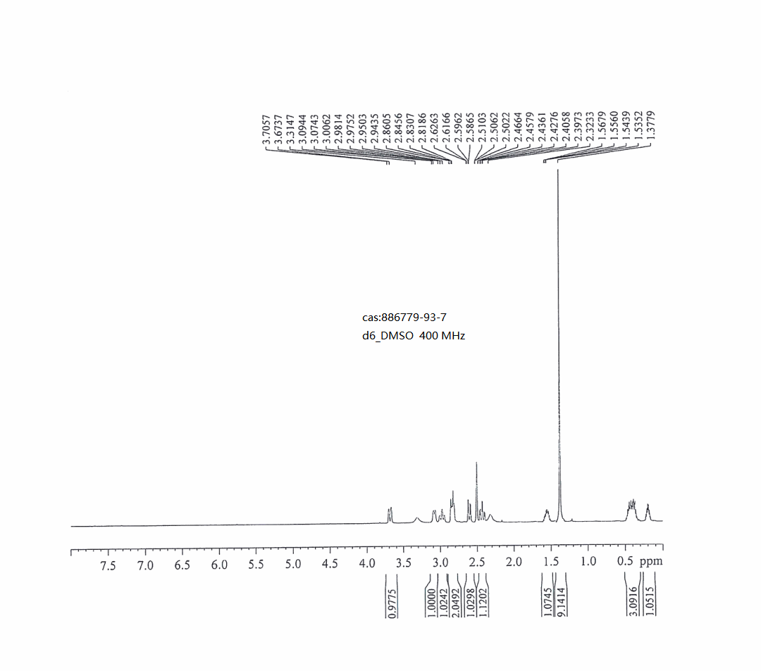 886779-93-7更多图谱2-CYCLOPROPYL-PIPERAZINE-1-CARBOXYLIC ACID TERT-BUTYL ESTER(886779-93-7)核磁图(1HNMR)