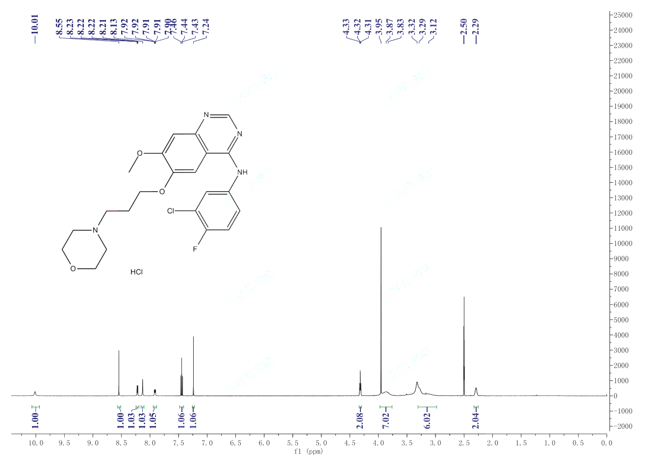 4-(3-氯-4-氟苯基氨基)-7-甲氧基-6-[3-(4-吗啉基)丙氧基]喹唑啉盐酸盐(184475-55-6)核磁图(1HNMR) 相关产品图谱