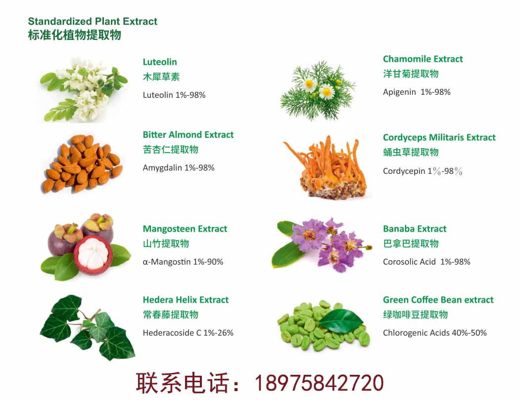 主要产品:杜仲提取物-绿原酸(5%-98%)、熊果酸(25%-98%)、科罗索酸(1%-98%)、苦杏仁苷(50%-98%)、藤茶二氢杨梅素(25-98%) 和其他标准化的高纯度植物提取物。