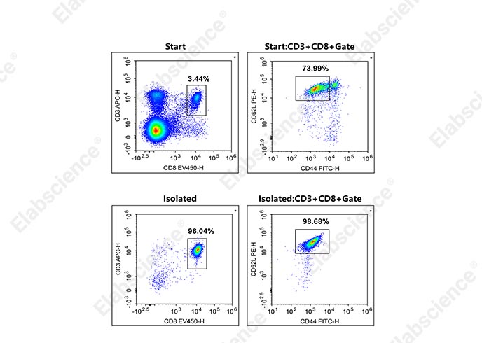小鼠初始CD8+T细胞阴性分选试剂盒采用阴性分选技术,通过特异性抗体标记非目标细胞,再利用磁珠结合去除杂质细胞,从而富集得到目标初始 CD8+T 细胞(CD3+CD8+CD44-/lowCD62Lhigh)。经流式细胞术检测验证,使用 APC Anti-Mouse CD3ε 抗体、Elab Fluor® Violet 450 Anti-Mouse CD8a 抗体等特异性抗体检测后,分选前初始 CD8+T 细胞比例仅为 2.55%,分选后纯度可高达 94.77%,确保目标细胞的高富集度。