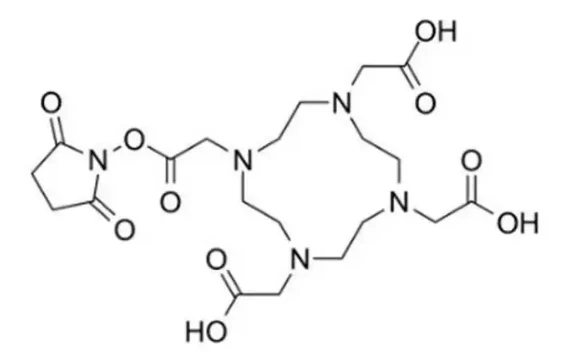 DOTA(1,4,7,10-四氮杂环十二烷-1,4,7,10-四乙酸)是一种多齿配体,能够与多种金属离子(如钆Gd3+、钇Y3+、镥Lu3+等)形成稳定的配合物。N-羟基琥珀酰亚胺酯(NHS酯)是一种高反应性的基团,能够与生物分子上的伯胺基(-NH₂)发生共价结合反应,形成稳定的酰胺键。